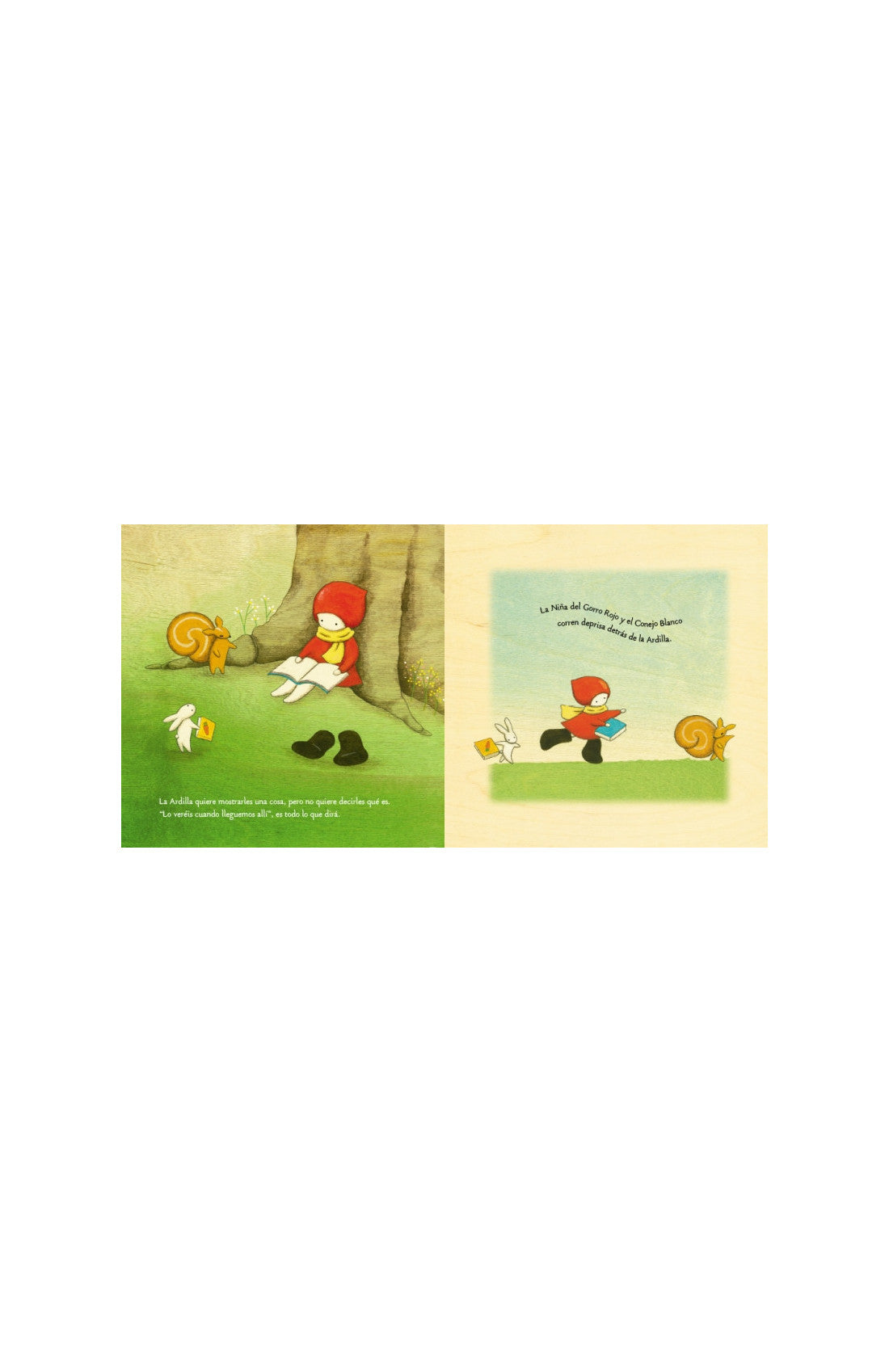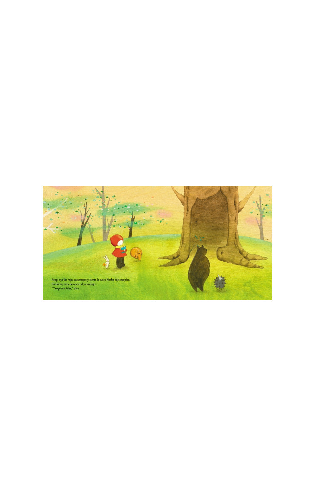 Entonces llega Ardilla, que insiste en mostrarles algo. Poppi y Conejo Blanco corren detrás de ella hasta un gran roble, en cuyo tronco hay un hueco grande y profundo. ¡Es un escondrijo!